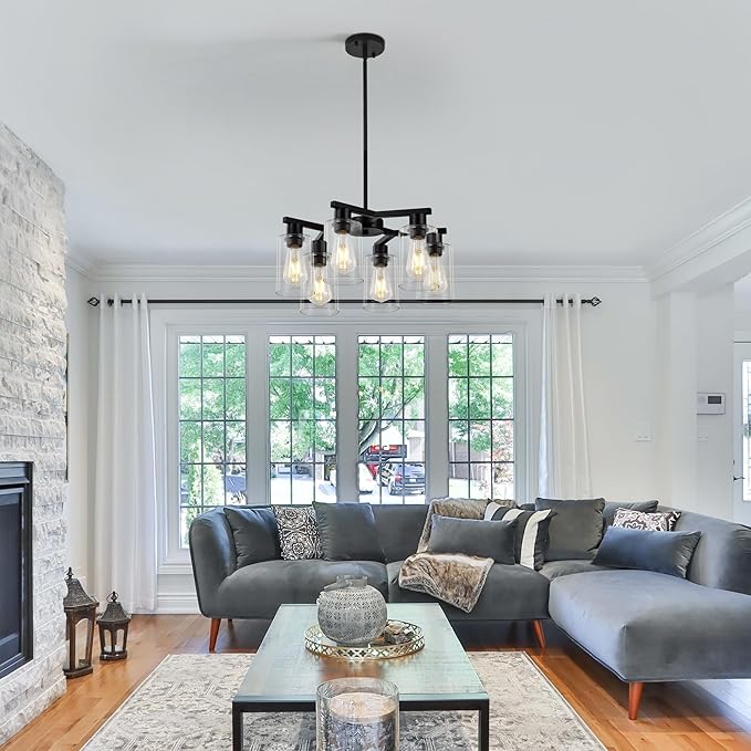 - Unique Design Aesthetic:Modern farmhouse chandelier features a matte black metal frame and 6 clear glass shades, creating visual tension between the cool, hard metal and lightweight glass. Dining room chandelier features a 360° downward glare-free design that reduces dust accumulation by 70%. Black light fixture is ideal for kitchen islands, dining tables, living rooms or bedrooms