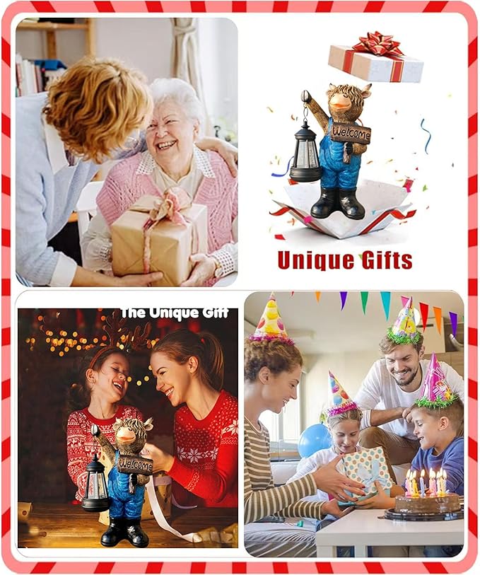 - 【Charming Cow Statue Design】 Features a playful cow figurine wearing bule overalls, holding an LED lantern in one hoof and a "WELCOME" sign in the other, with vivid facial details for whimsical outdoor charm.