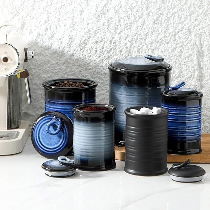 - [Food-Grade Ceramic] - Ceramic airtight lids not deform or going mouldy like wood/bamboo lids and won’t rust,canisters sets for the kitchen with silicone gasket creates an airtight and moisture proof environment to keep your food fresh and dry,the ceramic flour and sugar containers and lids are safe in dishwasher & microwave & oven & refrigerator.