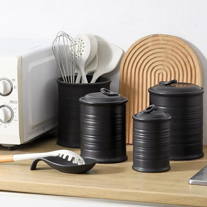 Nihow Food Storage Jar Sets: Ceramic Container with Air Tight Lid for Flour/Sugar/Rice/Coffee/Cookies/Candy - Seal Damp-proof Canister for The Kitchen - Set of 3 (Matte Black)
