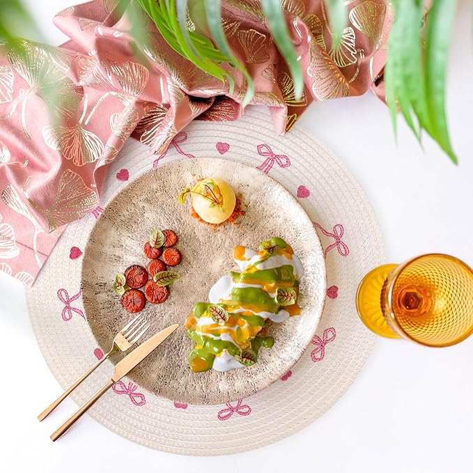 Whaline 4Pcs Round Placemats White Pink Bow Embroidered Place Mats Coquette Bowknot Heart Dinner Table Mats for Home Wedding Baby Shower Birthday Party Decor