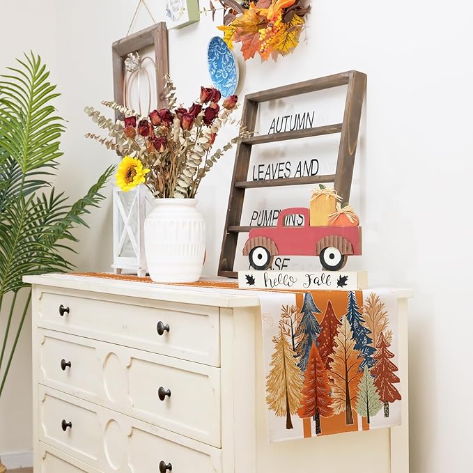 - [Fall-Inspired Design] Elevate your autumn decor with an artistically crafted table runner showcasing rich seasonal motifs and a warm, three-hue color palette. Designed to effortlessly enhance dining tables, consoles, or seasonal displays, its premium details and vibrant patterns infuse your space with cozy sophistication—perfect for creating a welcoming fall ambiance