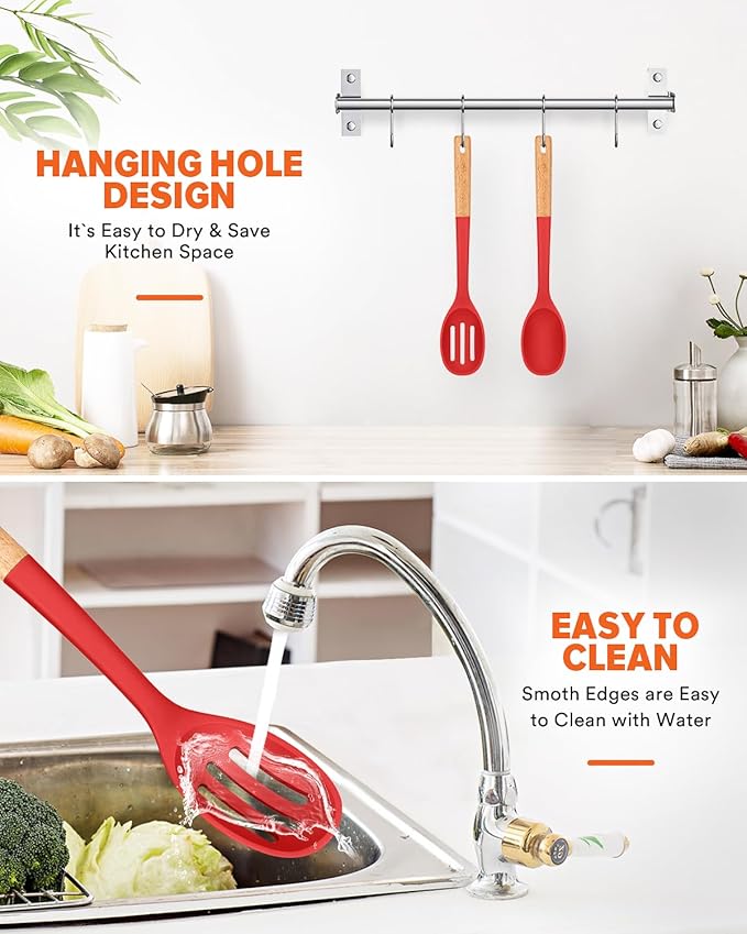 Silicone Cooking Spoons, Great for Scooping Sides and Serving Hearty Stews, BPA-Free Matte Silicone, Wooden Handle Serving Spoon for Nonstick Cooking Surfaces (Red)