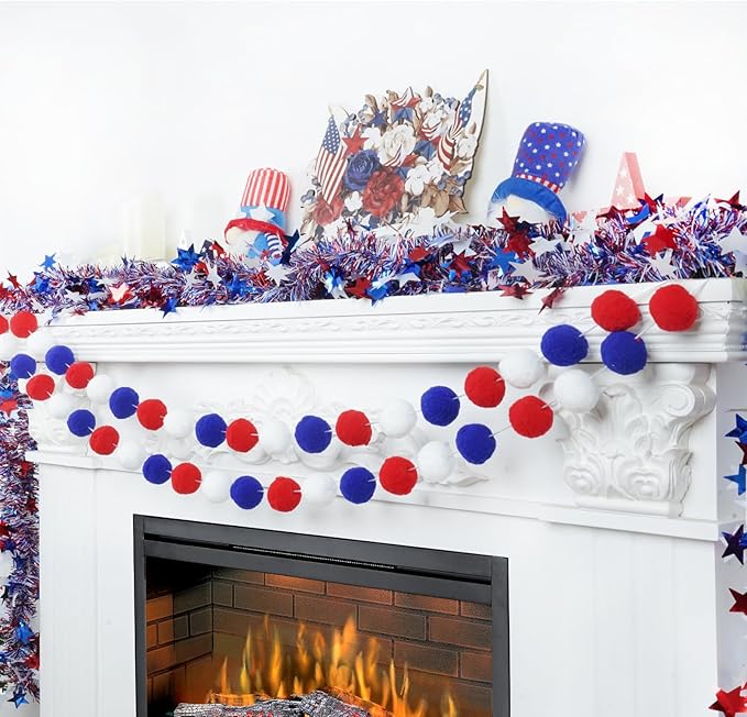 TBD Decor 3pk 4th of July Decorations Patriotic Red White Blue Pom Pom Garland 20FT 4cm Large Felt Ball Garland for Independence Day,Party Home Supplies Decorations