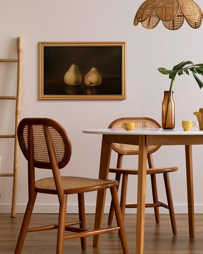 - CLASSICAL ROOM DECOR: Vintage Still Life Pear painting, this wall art picture print utilizes the classic chiaroscuro technique. The two pears, gently leaning toward each other, symbolize a sense of companionship—whether familial, friendly, or romantic. Or abundance, life, and family. The detailed rendering of the fruit’s delicate blemishes and organic imperfections lends an authentic, timeworn charm to the artwork. Inviting viewers to reflect on the beauty of simplicity and everyday life