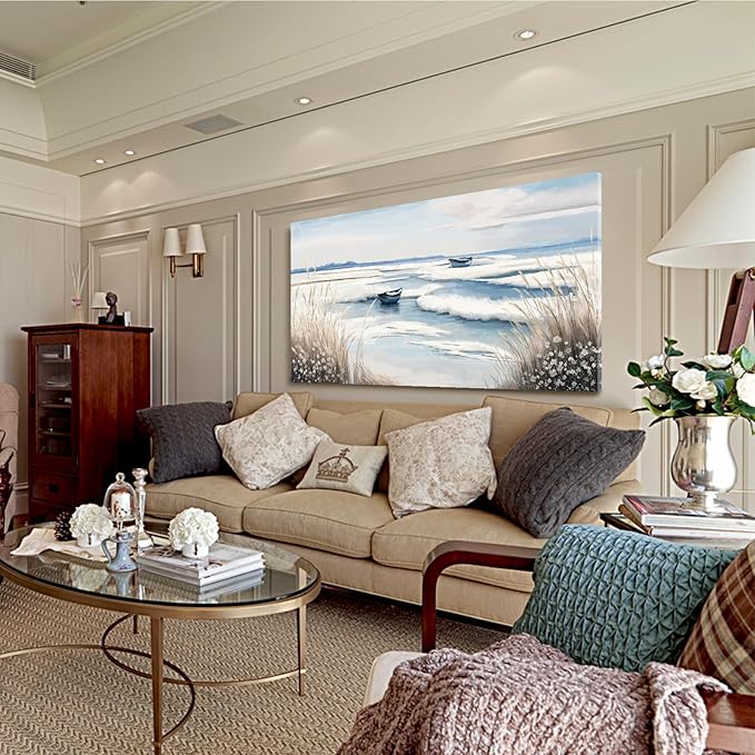 - Modern Coastal Aesthetic – Designed with soft neutral tones of blue, beige, and cream, this large artwork brings a calming and sophisticated coastal vibe to any modern or transitional space.