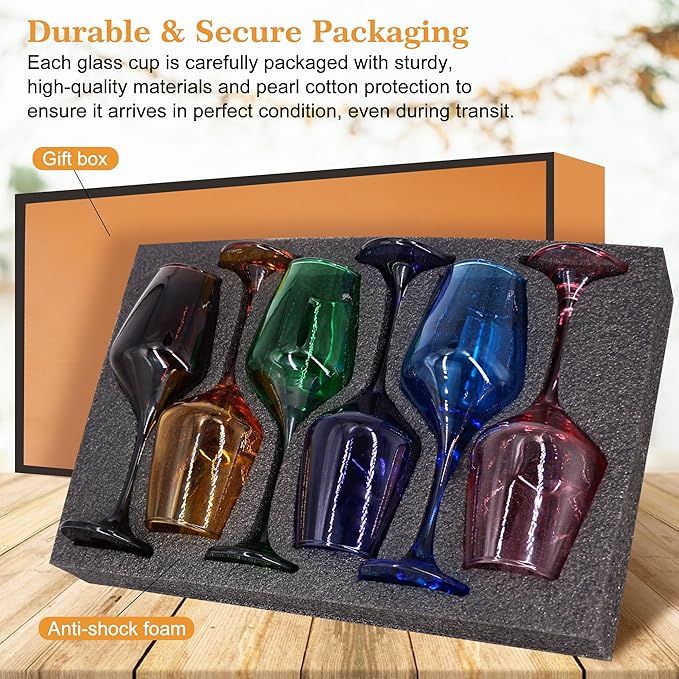 - 【Elegant and Secure Packaging】Glazvia unique wine glasses is carefully packaged in an elegant and durable box to ensure safe delivery. The sturdy packaging protects the colorful glasses drinkware during shipping, so you can be confident they will arrive in perfect condition. Whether purchasing for personal use or as a wine glasses gift set, this thoughtful packaging adds an extra touch of sophistication, making the unique wine glasses set of 6 as an wine glass gifts for women.