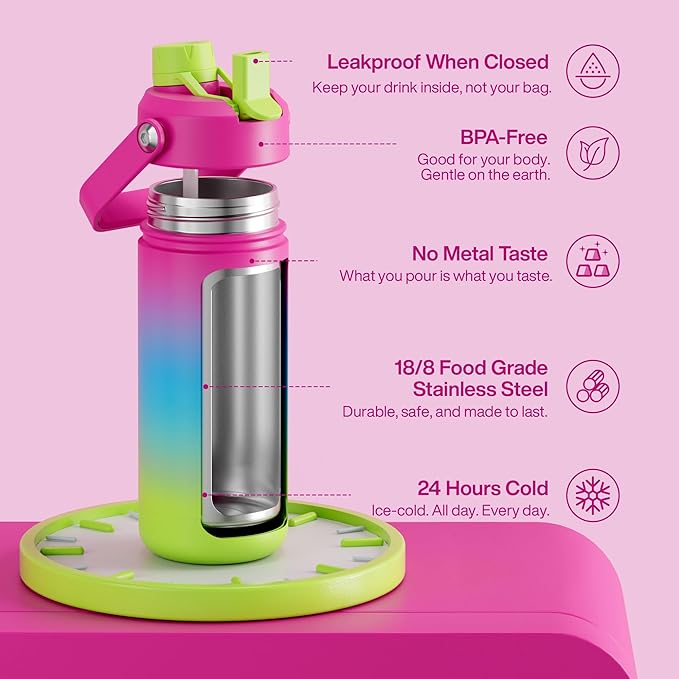 Insulated Water Bottle with Straw Stainless Steel Water Bottle, Leak-Proof, BPA-Free, Double Wall Vacuum Keeps Cold for 24 Hours for Sports, Travel, School (18 oz, Lime Sorbet)
