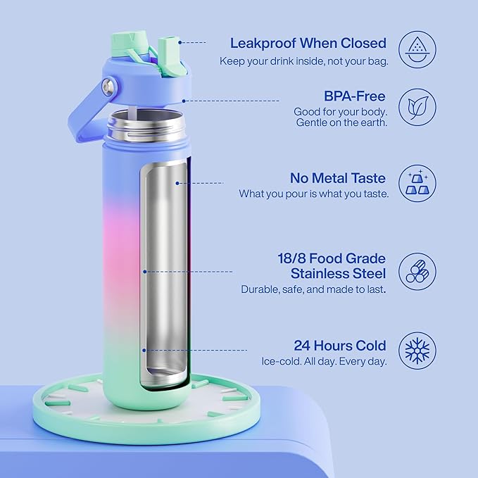 - Cold All Day Long: Our insulated water bottle keeps drinks cold for up to 24 hours. Double-wall stainless steel, zero condensation, just fresh hydration, wherever you go