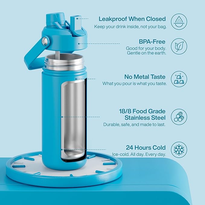 Insulated Water Bottle with Straw Stainless Steel Water Bottle, Leak-Proof, BPA-Free, Double Wall Vacuum Keeps Cold for 24 Hours for Sports, Travel, School (18 oz, Azure Blue)