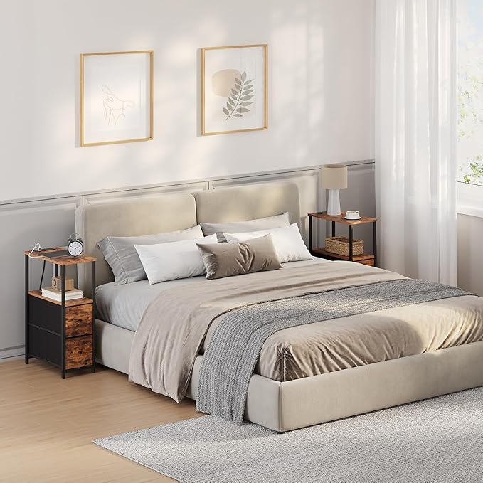 TUTOTAK Small Narrow End Table with Charging Station, Side Table with Outlets, Nightstand with 2 Cloth Drawers, Couch Table, for Living Room, Bedroom, Bedside, Brown TB01BB085