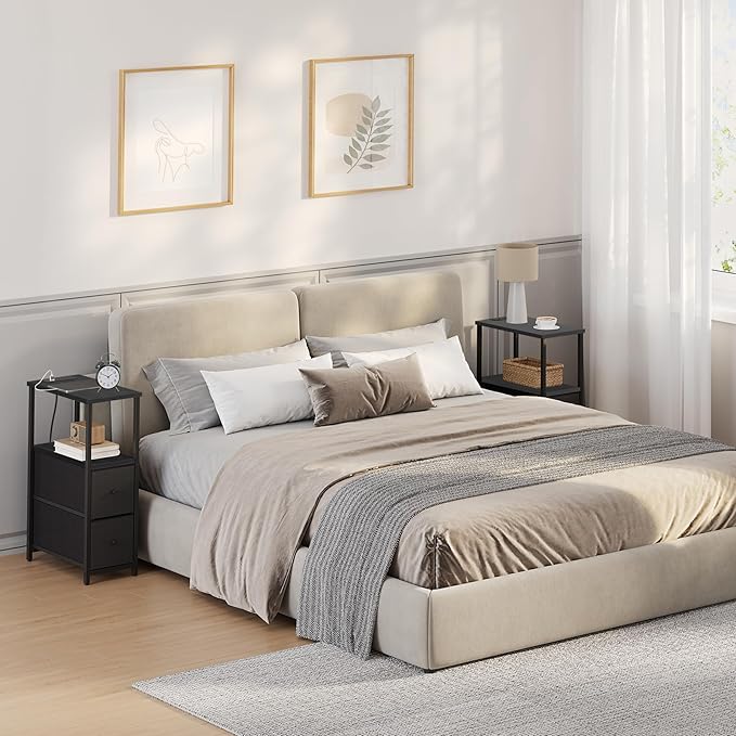 TUTOTAK Small Narrow End Table with Charging Station, Side Table with Outlets, Nightstand with 2 Cloth Drawers, Couch Table, for Living Room, Bedroom, Bedside, Black TB01BK085