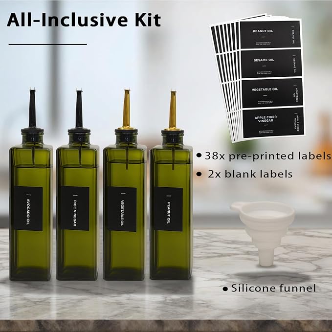 - Complete Gourmet Gift Set - Ready to Impress: Everything included for the food lover! This olive oil dispenser set includes four 16.9oz glass bottles (perfect for olive oil and vinegar), drip-free spouts, and labels. Gift-ready as a glass oil vinegar dispenser set, avocado oil dispenser for kitchen, or decorative oil dispensers for kitchen. Sophistication meets practicality – the ideal oil and vinegar dispenser set or cruets for vinegar and oil.