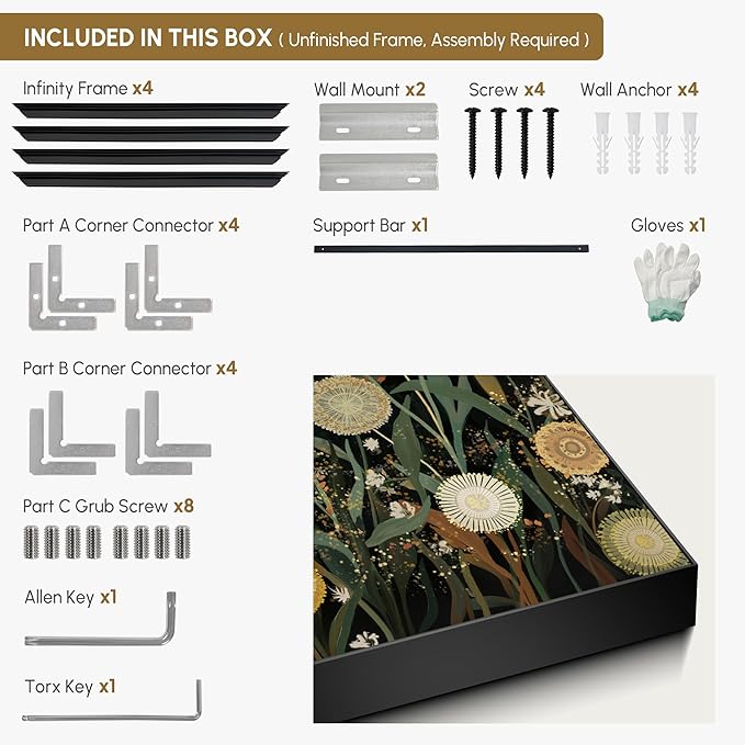 - Assembly Required: The artwork comes with the frame components unassembled. Don¡¯t worry ¡ª setup is straightforward and tool-friendly. For best results and accurate alignment, we recommend two people to ensure a smooth assembly and a stable, secure wall mount.