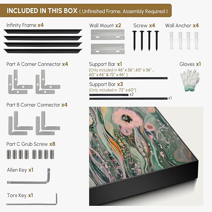 - Assembly Required: The artwork comes with the frame components unassembled. Don’t worry — setup is straightforward and tool-friendly. For best results and accurate alignment, we recommend two people to ensure a smooth assembly and a stable, secure wall mount.