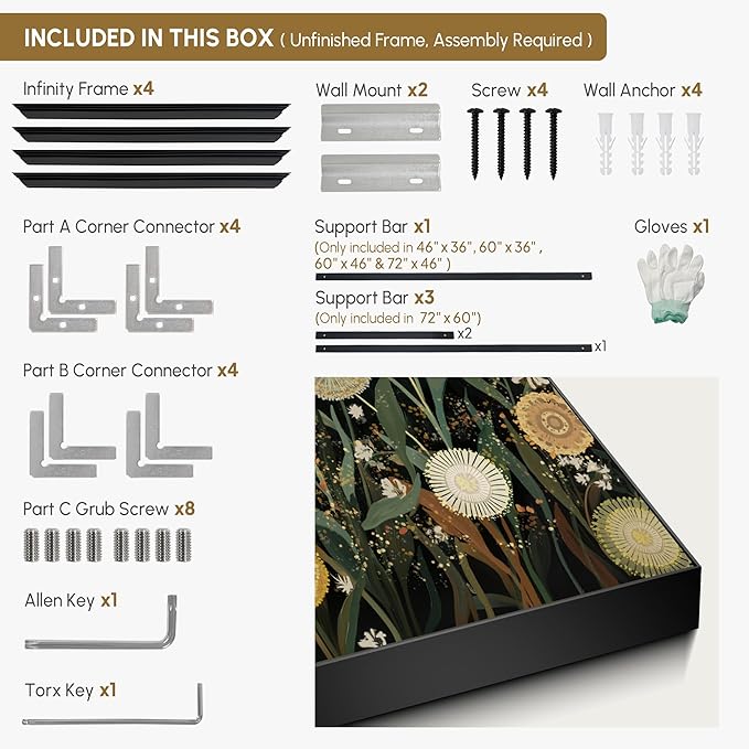 - Assembly Required: The artwork comes with the frame components unassembled. Don’t worry — setup is straightforward and tool-friendly. For best results and accurate alignment, we recommend two people to ensure a smooth assembly and a stable, secure wall mount.