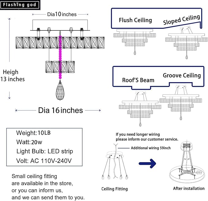 - 【Crystal Chandelier Size】 Specification: Dia 16" x H13" ,Weight approximately 10 lb