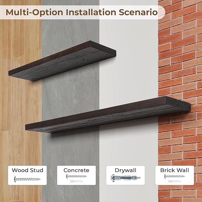 - SMART MOUNTING SYSTEM: Axeman storage wall shelves have a heavy-duty hidden bracket that can be easily installed into wall studs, with each solid wood floating wall shelf capable of holding up to 45 lbs. The flush mount design ensures that the metal brackets are invisible after installation, while screws at the bottom secure the floating shelves from sliding off