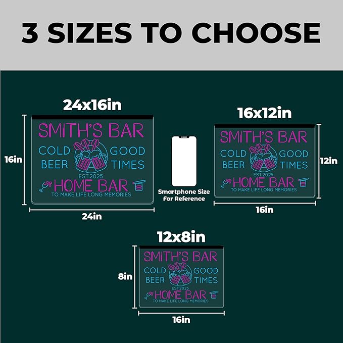 - Custom bar signs for home bar wall light up your space with flair. Custom bar signs for home bar wall light up décor with just the right LED glow. Ideal for man caves, home theaters, salons, or cafes. Handmade to impress—no design fees, perfect gift for any space. Disclaimer-The image is for color reference only. All product details are shown in the main image, and you will receive the design for final approval before we ship it to you