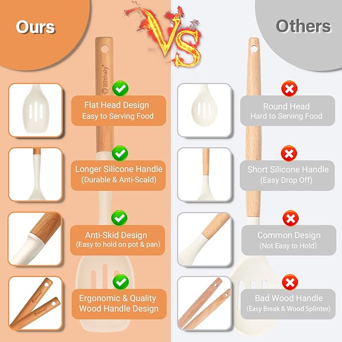 - 🏆【Easy to Clean & Attention】Our silicone cooking spoon set have smooth surface which is easy to clean. Attention: This product comes with a natural wood handle. Please do not soak it in water for a long time or use a dishwasher. Avoid using a hard or abrasive dishwashing brush to clean the wooden handle. It is recommended to clean it by hand with clean water or gently wipe it with a soft cloth. Make sure the wooden handle is completely dry before storage.