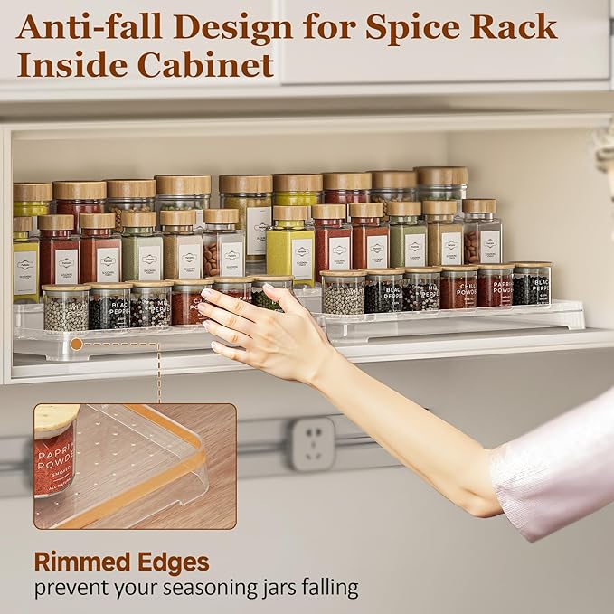 - NO-SLIDE, NO-SWEAT: This spice organization for cabinet locks bottles/cans with raised grip dots. Your non-slip spice organizer wipes spills in 3 seconds flat (smooth surfaces + rounded corners). It is perfect for organizing spices, soup cans, pasta sauces, veggies – any countertop clutter.