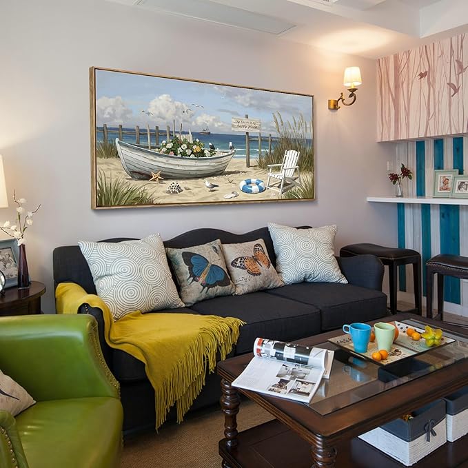 - Coastal Serenity for Your Space: Infuse your home with the peaceful charm of the shore through this 48x24 inch coastal framed wall art. Showcasing a rustic flower-filled boat resting quietly on sandy dunes, with soft ocean waves, scattered seashells, and graceful seabirds, this piece brings serene seaside vibes to any setting—whether your beach-style bathroom, breezy bedroom, or cozy entryway.