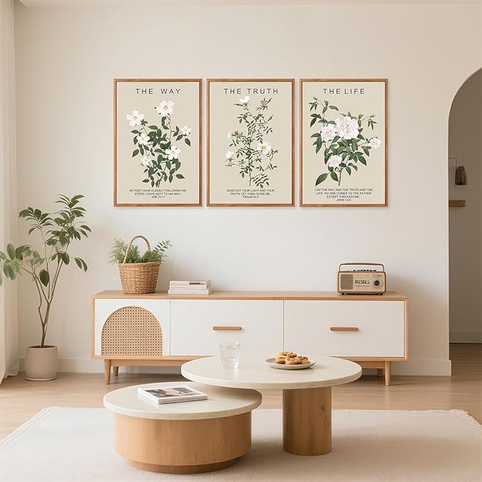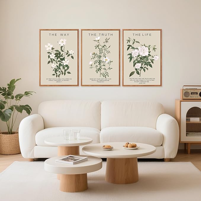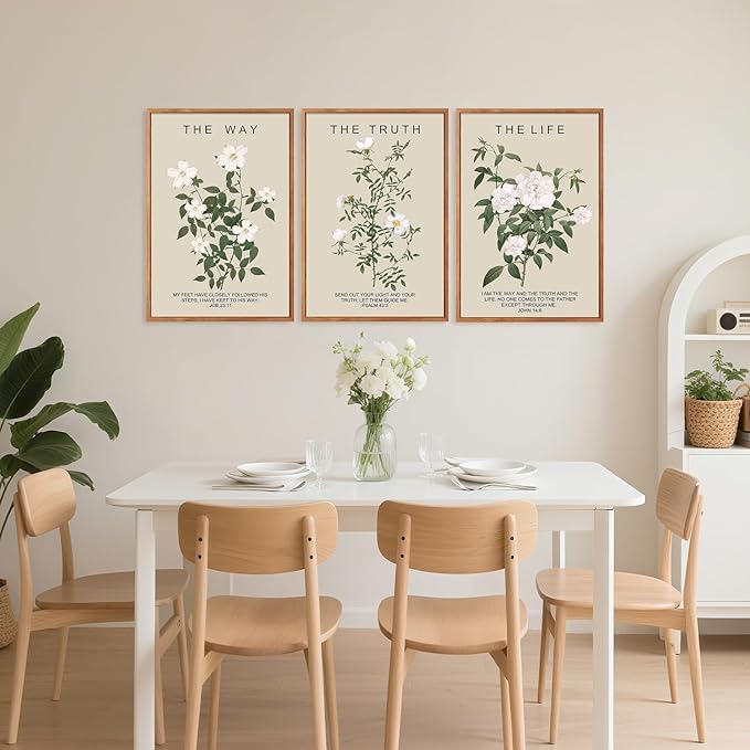 - The Way The Truth The Life Wall Art-- Aurlan christian jesus wall art framed is unified, featuring a simple and elegant design complemented by fresh botanical patterns and classic religious quotations, conveying a serene and sacred atmosphere.