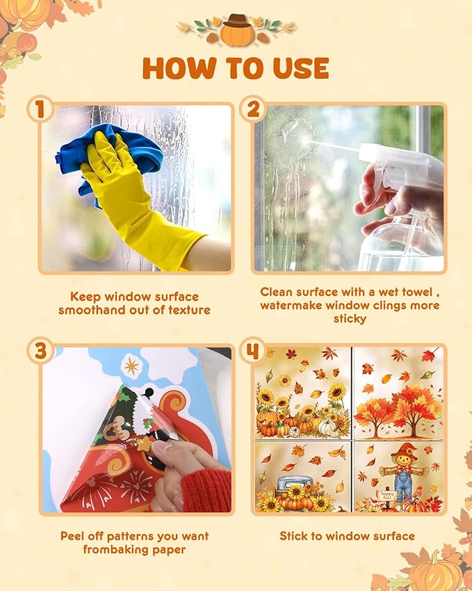- Perfect Fall Decor: These autumn window clings are ideal for decorating windows, glass doors, mirrors, display cases, offices, schools, and stores. They're perfect for Thanksgiving parties, harvest festivals, and fall-themed events. They also make a thoughtful gift for family and friends. Gather your loved ones to enjoy the fun of DIY decorating and create unforgettable seasonal memories together!