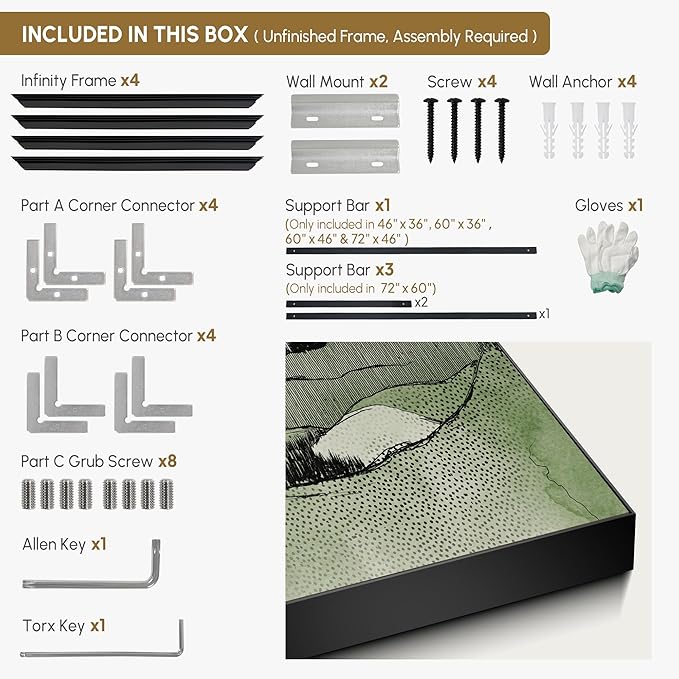 - Assembly Required: The artwork comes with the frame components unassembled. Don¡¯t worry - setup is straightforward and tool-friendly. For best results and accurate alignment, we recommend two people to ensure a smooth assembly and a stable, secure wall mount.