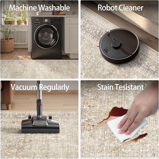 - 【Ultimate Kids & Pets Area Rug Defense】Vintage neutral beige 8x10 area rug living room low-pile 1/4" thickness actively resists pet hair, dander, and spills—stains wipe away instantly. gentle on paws/claws, low pile 8x10 area rugs beige prevents chewing damage and floor scratches, making it the ideal kids & pets friendly beige washable rug 8x10.