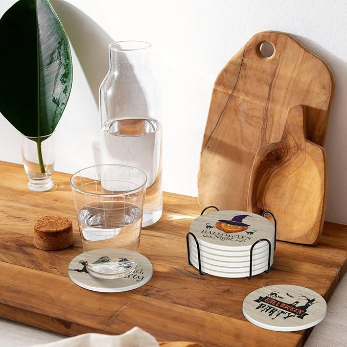 Halloween Coaster for Drinks Set of 6 with Metal Holder and Cork Base Ceramic Drink Coasters Absorbent Cup Mat Non-Slip for Home Kitchen Office Table Decor, 4 Inch