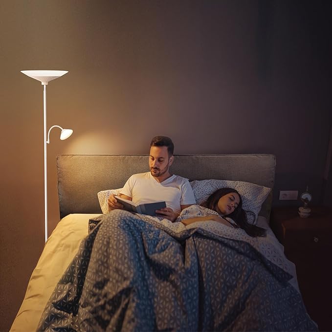 - 【Dual-Zone Lighting】This upgraded torchiere led floor lamp, adjust brightness (10%-100%) and color temperature (3000K-6500K), the warm light creates cozy ambiance for movie nights or relaxation, the natural light provides flicker-free illumination for reading/working.