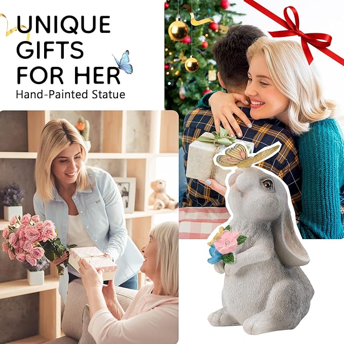 Solar Bunny Statues Light with Butterfly LED - Auto On/Off Weathproof Resin Garden Figurine Decor Gift for Pathway, Patio & Mom's Flower Bed (Warm Light)