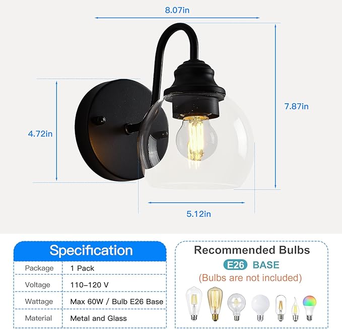 - [Excellent wall lamps]: Two sets of wall lamps are composed of transparent glass lampshades and metal bases. The transparent glass lampshades ensure good light transmittance. The gooseneck design not only restores the classic farmhouse style but also brings a touch of tenderness to your space, making it less rigid. The manufacturing process of matte black metal paint ensures that the wall lamps will not oxidize or fade.