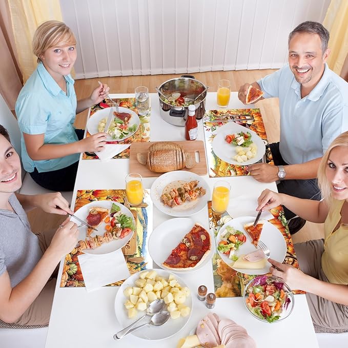 - Premium Material: Our fall harvest placemats are crafted from plastic. The Thanksgiving pumpkin placemats are waterproof, heat-proof and odorless, making the fall place mats durable and supporting long-term use. Also, the vibrant colors will remain bright over time