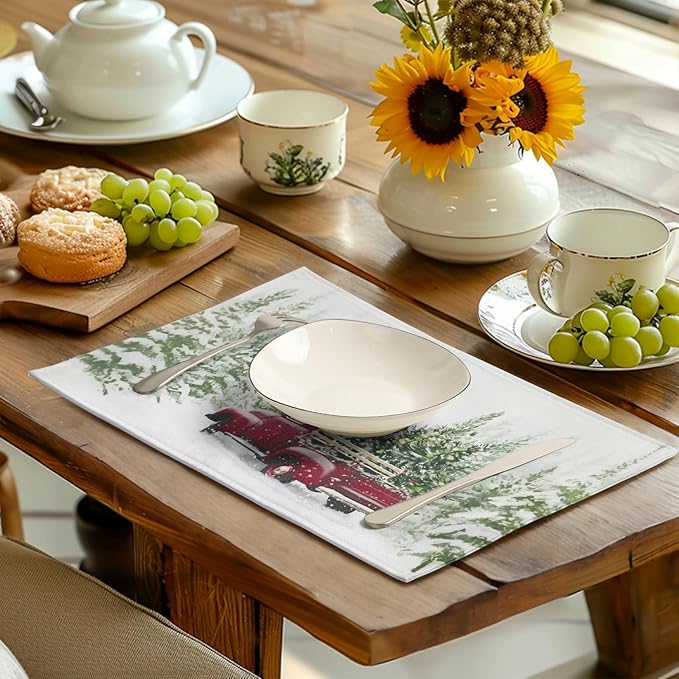 - TABLE DECORATION: Christmas holiday placemats feature high-definition printing technology for crisp, clear patterns and vibrant colors; rectangle placemats with a red truck and pine tree pattern; unique and eye-catching seasonal patterns add charm to farmhouse table place mats, creating a winter and Christmas atmosphere for your party
