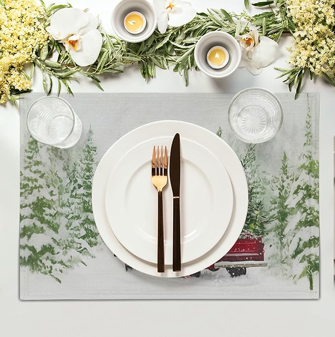 - VERSATILE OCCASIONS: Christmas pine tree truck table place mats are suitable for different occasions and are an excellent decorative mat for any indoor or outdoor setting, such as kitchens, dining tables, hotels, restaurants, coffee shops, and business offices. They are also a beautiful decoration for banquets, dinners, receptions, housewarming, family gatherings, parties, and leisure kitchens. This will definitely leave a deep impression on the guests